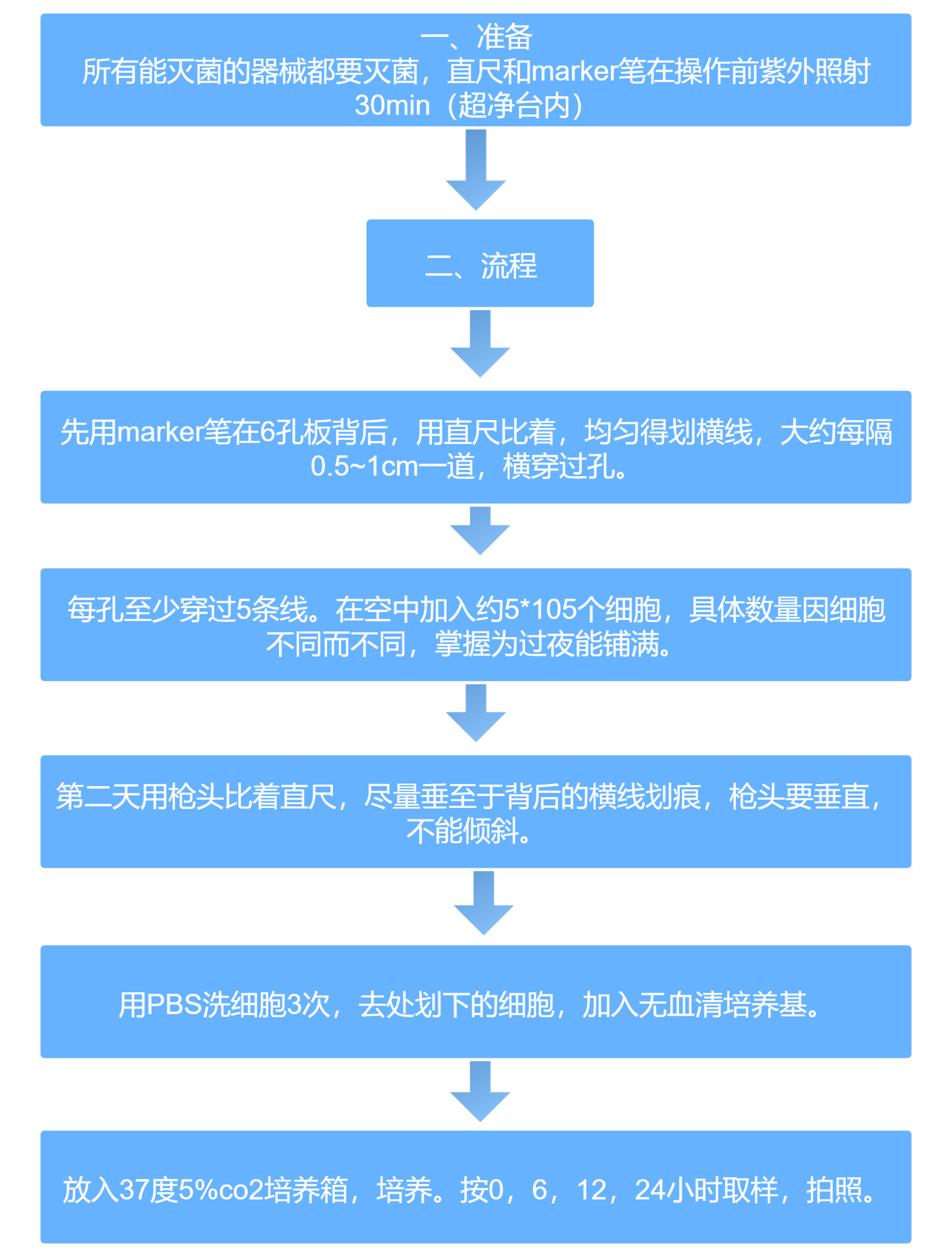 细胞划痕是一种简单易行的检测细胞运动的方法,实验成本低,可以用来检测贴壁生长肿瘤细胞的侵袭转移能力。