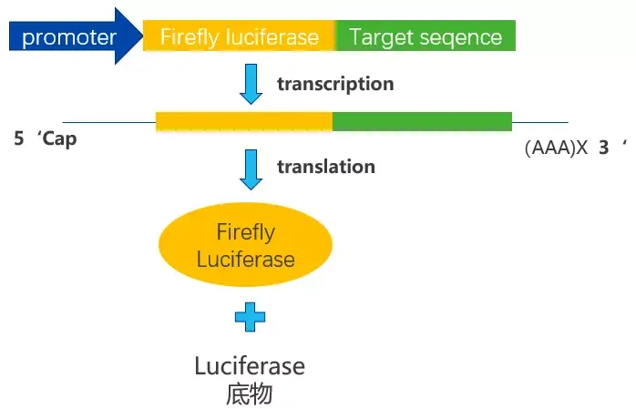 萤火虫荧光素酶一般是作为主报告基因,将目的基因构建在该载体上,从而反应目的序列的作用结果,因此根据我们的实验目的,可以针对此质粒进行改造,载体的工作原理如下图所示: