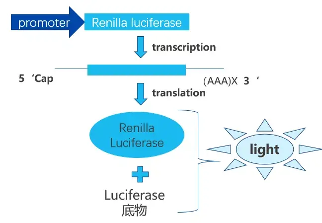 海肾荧光素酶通常作为内参报告基因,在实验操作的过程中,常遇到由于个人操作造成的实验误差,比如细胞数目不均一、细胞代次不统一、转染效率不一致等。引入一个内参报告基因,以此来标定检测用报告基因的测量结果,从而达到有效地减少实验误差的目的,载体的工作原理如下图所示: